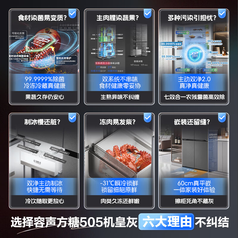 容声方糖505机皇双净双系统十字四开门超薄嵌入式电冰箱家用自动制冰一级能效BCD-505P60CZNAD国家补贴