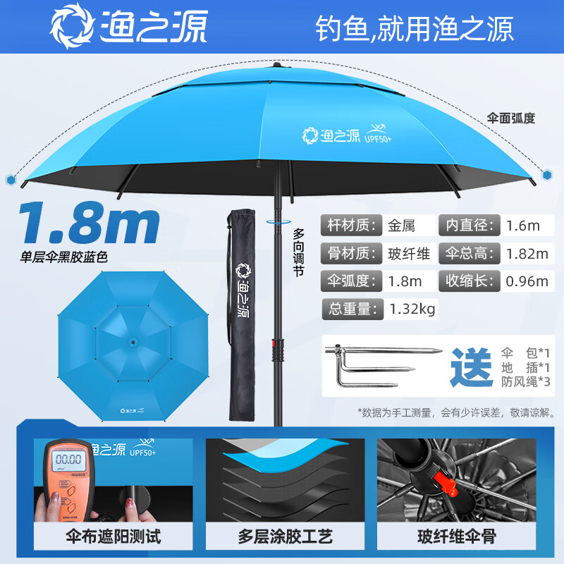 渔之源钓鱼伞防雨垂钓加厚多向钓伞渔具伞户外钓鱼遮阳伞 1.8米 【单层轻便 加厚黑胶】UPF50+更防晒