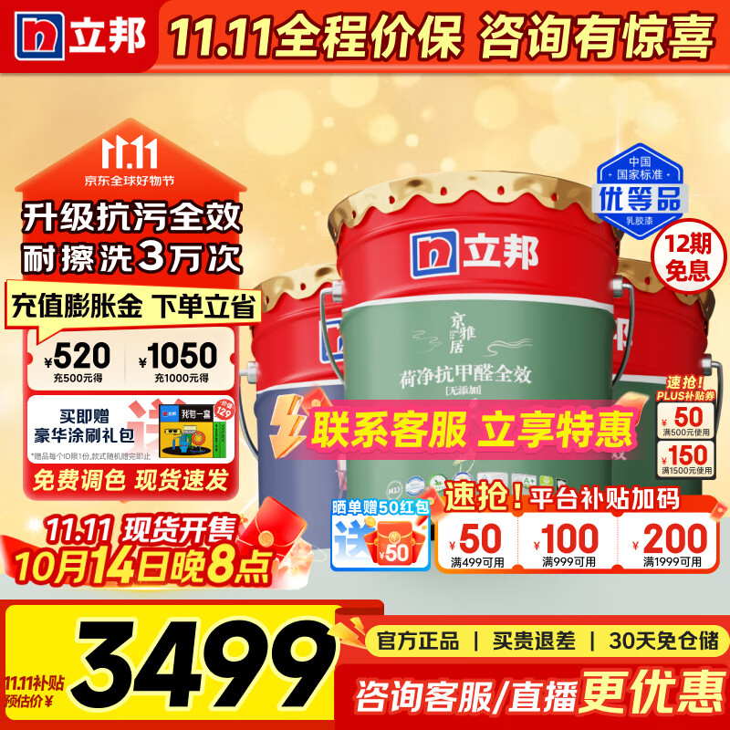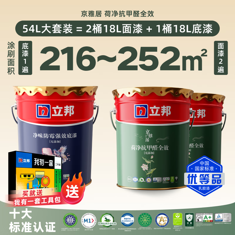 立邦瓷净墙面乳胶漆荷净抗污抗甲醛全效油漆内墙漆室内家用涂料 【升级抗污全效】54L 套装(2面1底) 免费调色