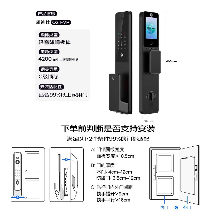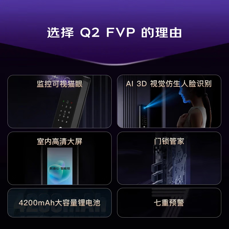 凯迪仕(KAADAS)Q2 FVP智能门锁 3D人脸识别猫眼大屏指纹密码锁全自动智能防盗锁 Q2 FVP【人脸解锁+AI猫眼+大屏】