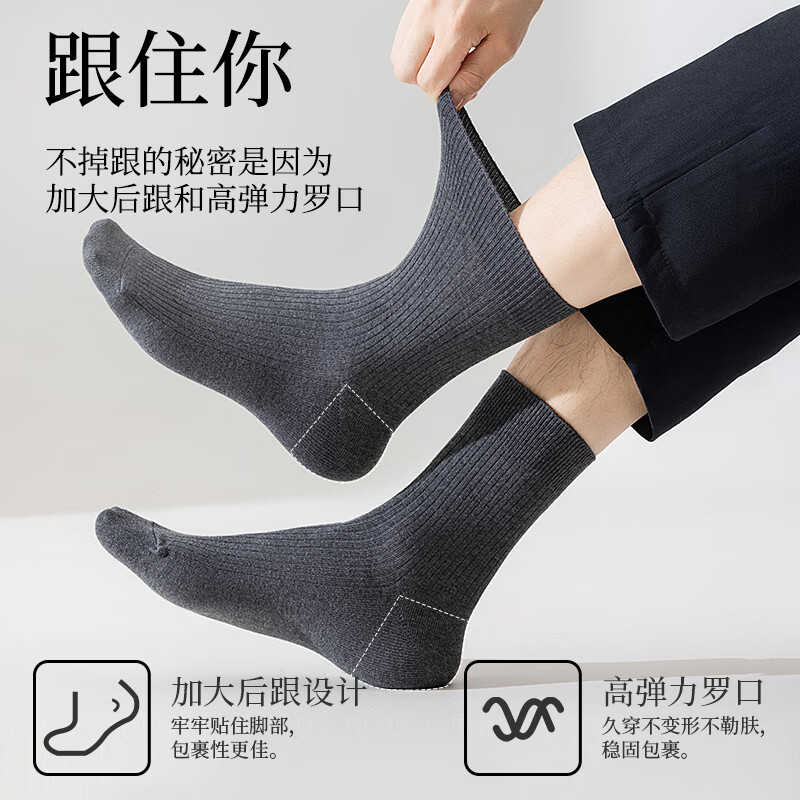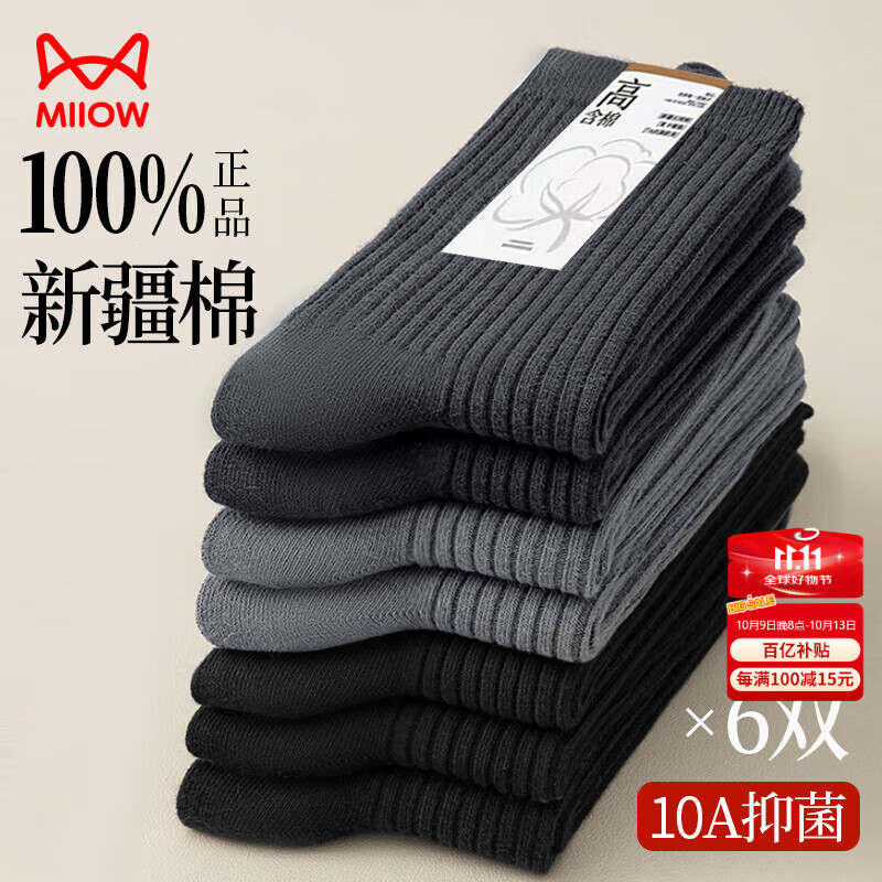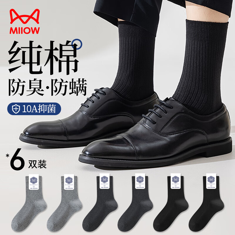 猫人6双男士袜子男100%纯棉双针中筒袜秋冬季全棉抑菌防臭商务袜