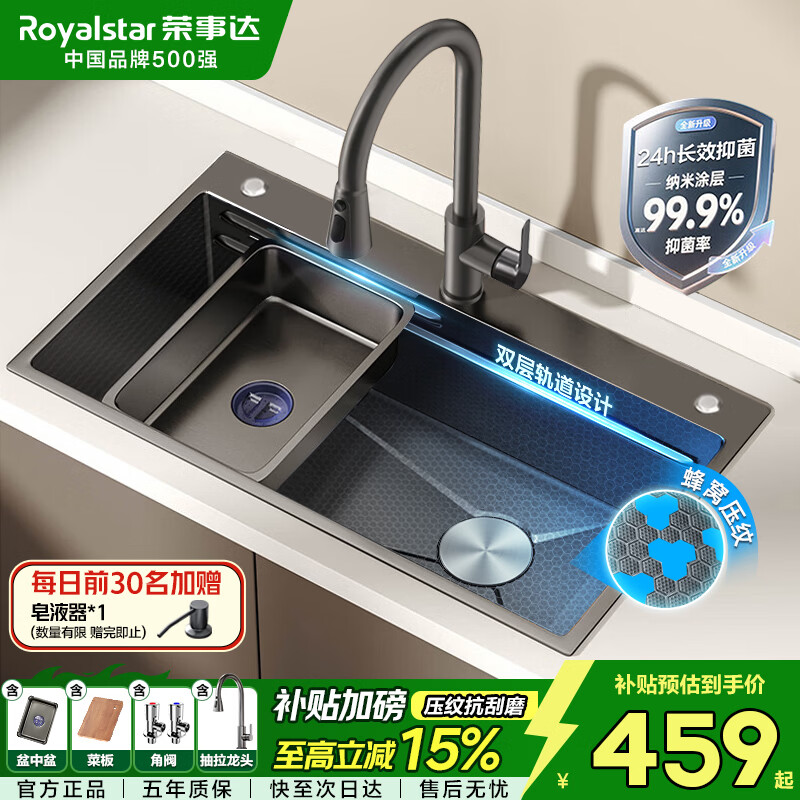 荣事达(Royalstar)厨房水槽不锈钢纳米蜂窝压纹耐刮磨双台阶送抽拉龙头68*45