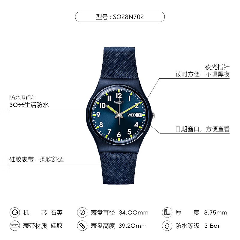 斯沃琪(Swatch)瑞士手表 绅士蓝2.0 双日历节日礼物石英男女腕表考试表 SO28N702