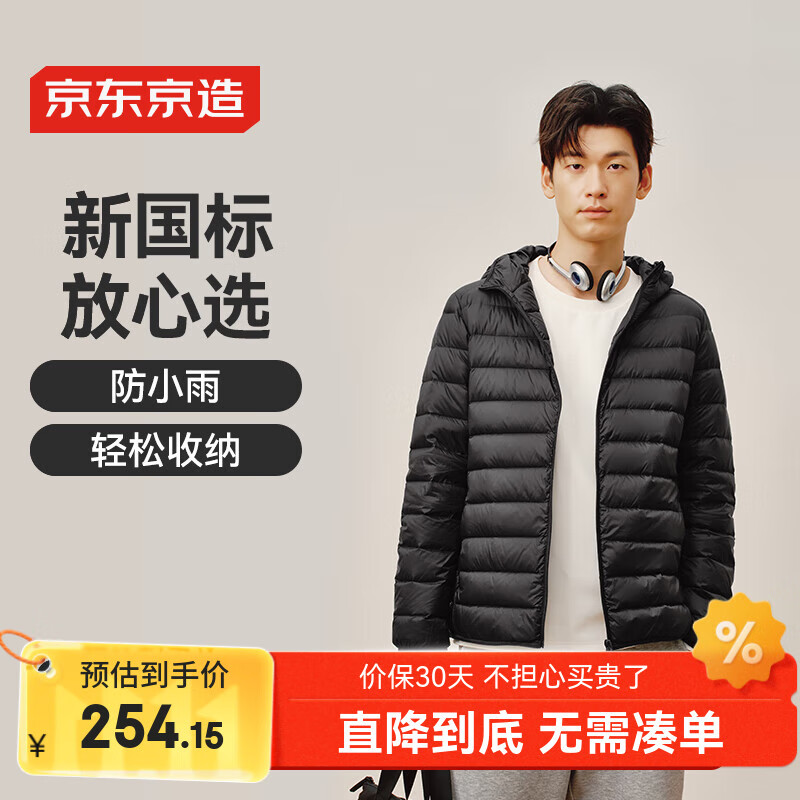 京东京造【air+零压羽绒】轻薄羽绒服男外套冬连帽白鸭绒 曜石黑M