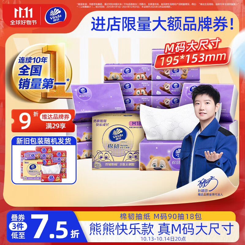 维达(Vinda)抽纸 棉韧3层90抽*18包M码 熊出没IP 快乐款 纸巾 新旧随机发货