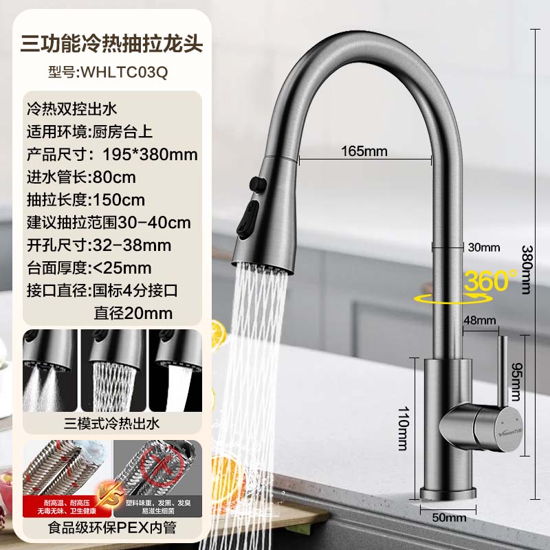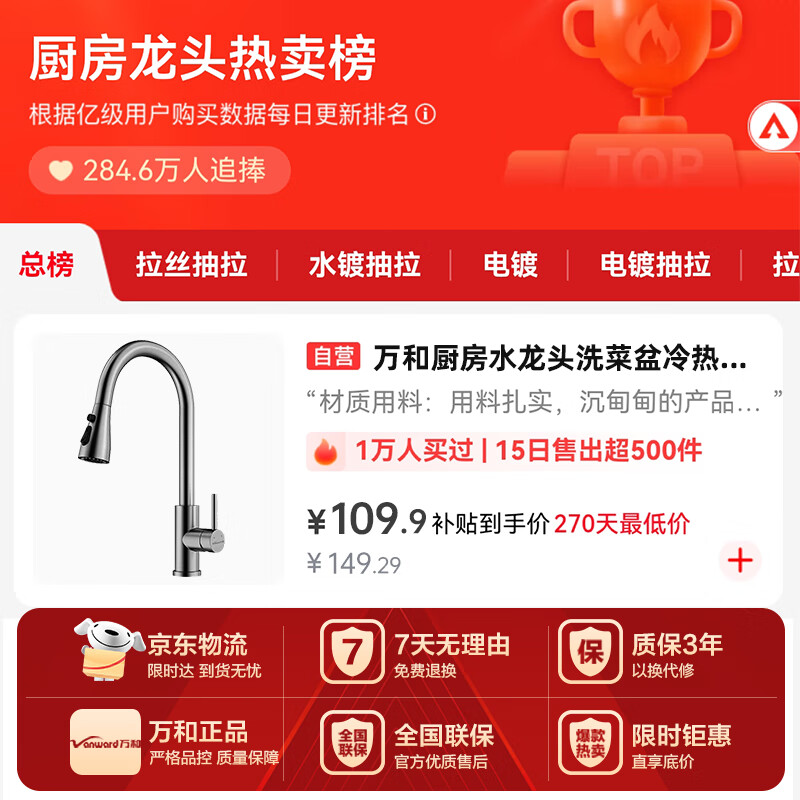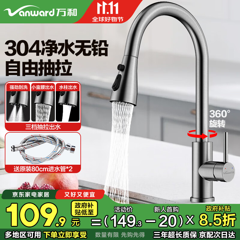 万和厨房水龙头洗菜盆冷热抽拉式水龙头家用304不锈钢洗碗盆水槽龙头