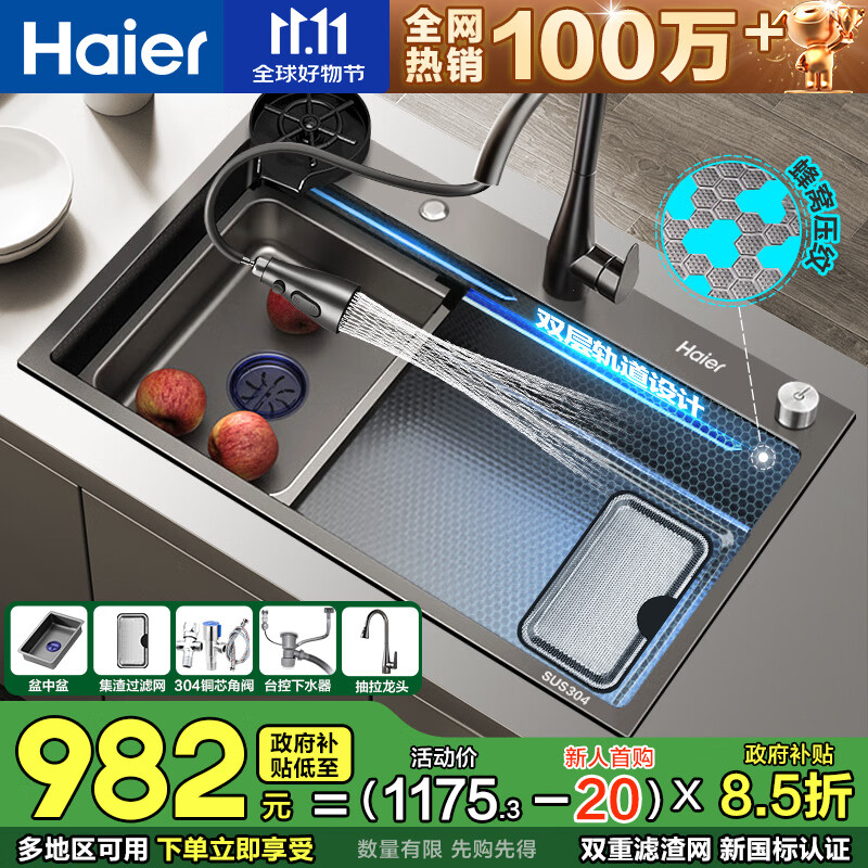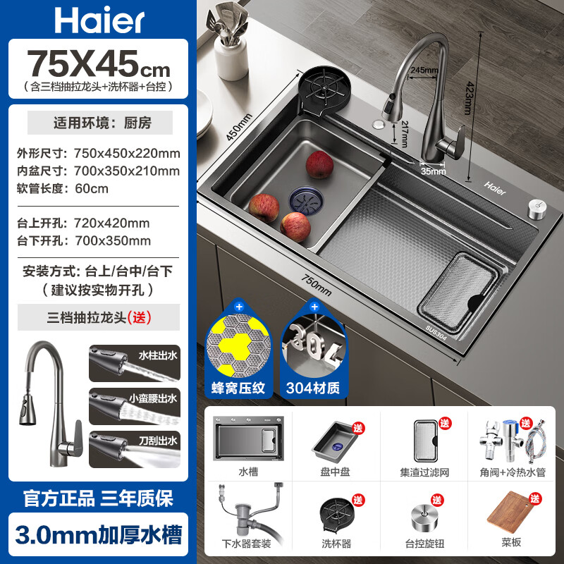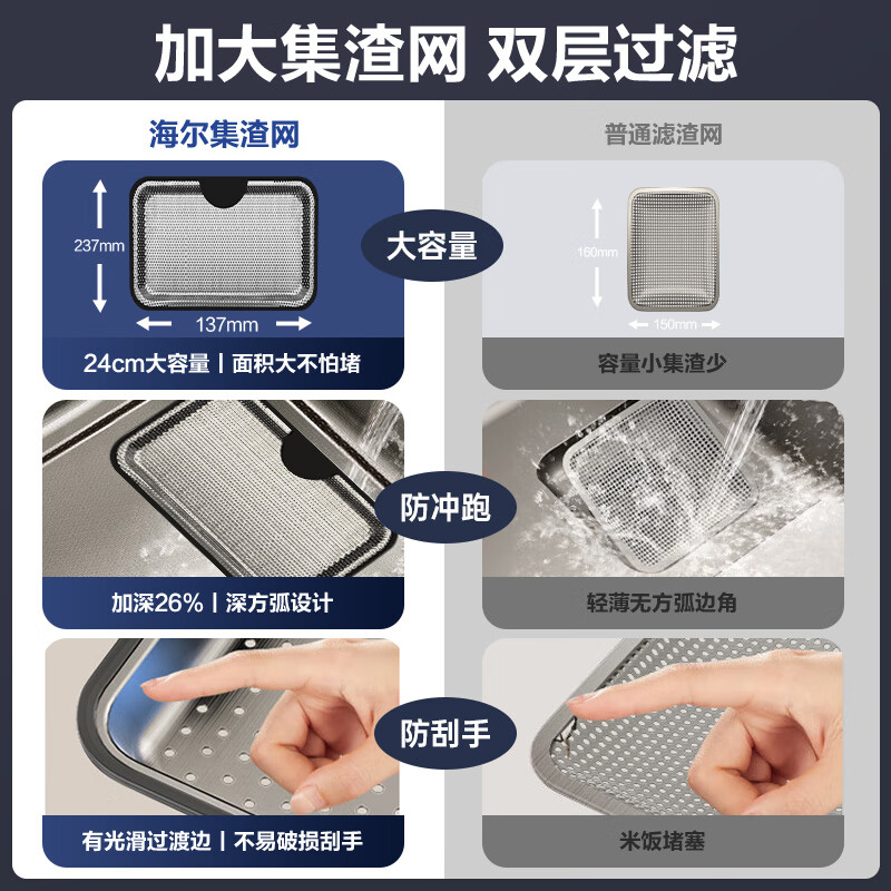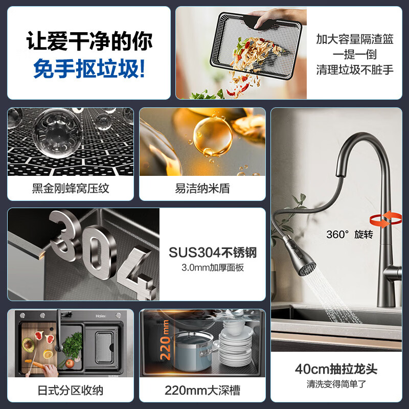 海尔水槽大单槽洗菜盆一体盆单槽厨房304不锈钢水槽双重滤渣洗碗槽