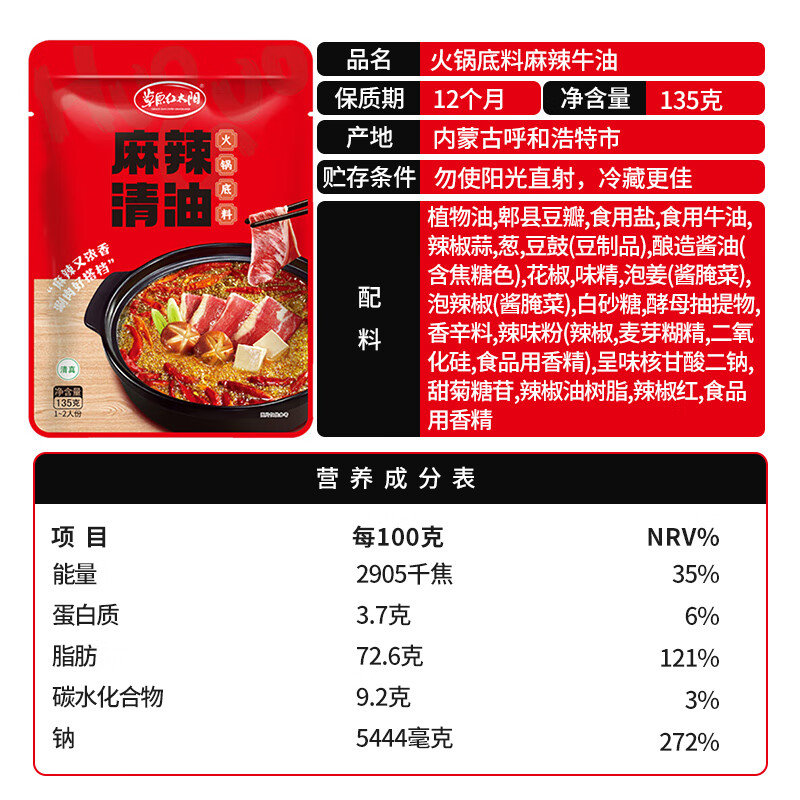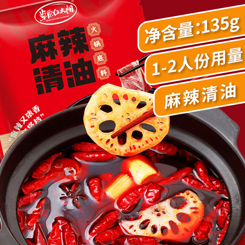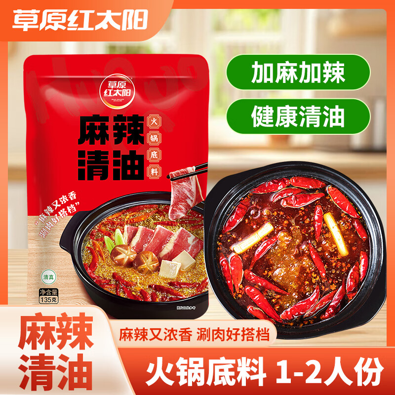 草原红太阳火锅底料 麻辣清油火锅底料135g 1~2人份火锅底料 麻辣烫底料