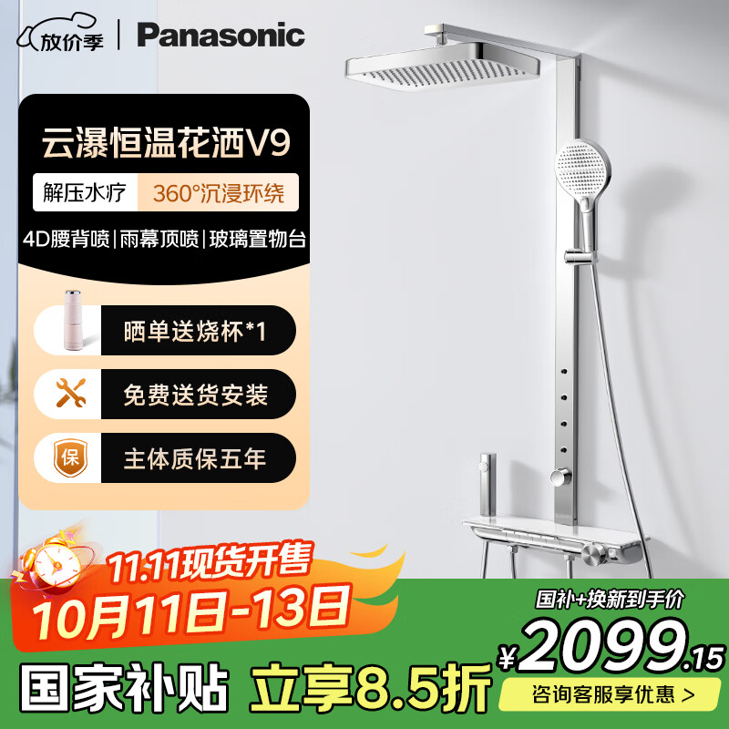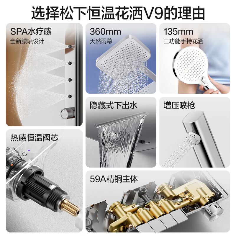 松下(Panasonic)智能恒温花洒淋浴套装V9 顶喷4D腰背喷全铜家用浴室洗澡