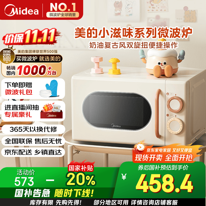 美的小滋味系列微波炉变频家用小型奶油风百搭复古转盘式一级能效低频轻音20L预制菜加热(M2H1)