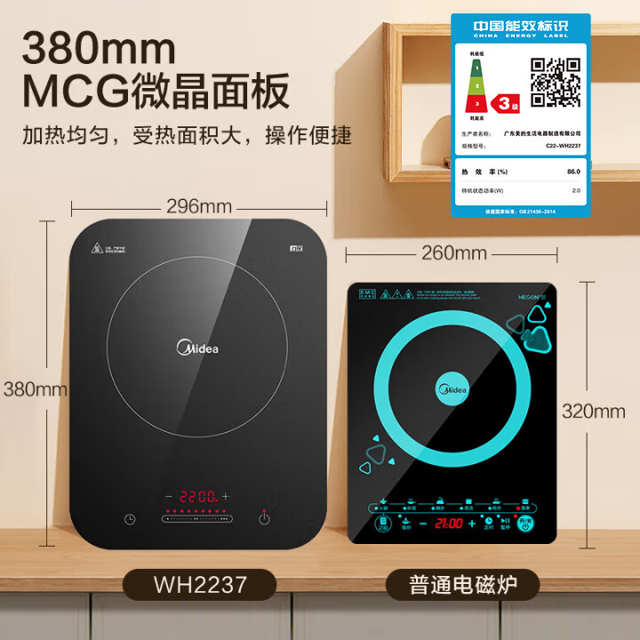 美的(Midea)电磁炉电陶炉 家用大功率 2200W 恒匀火技术 智能定时 火锅炒菜套装微晶面板 政府补贴C22-WH2237