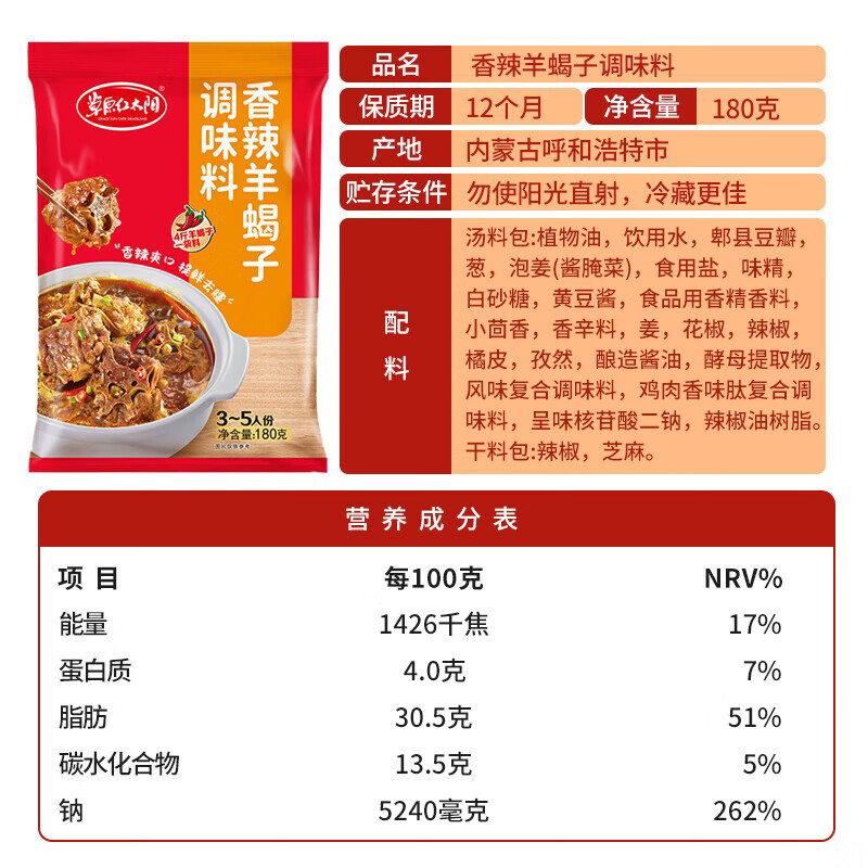草原红太阳内蒙古风味 羊蝎子调料香辣味180g 炖牛羊肉火锅底料炖料调味品