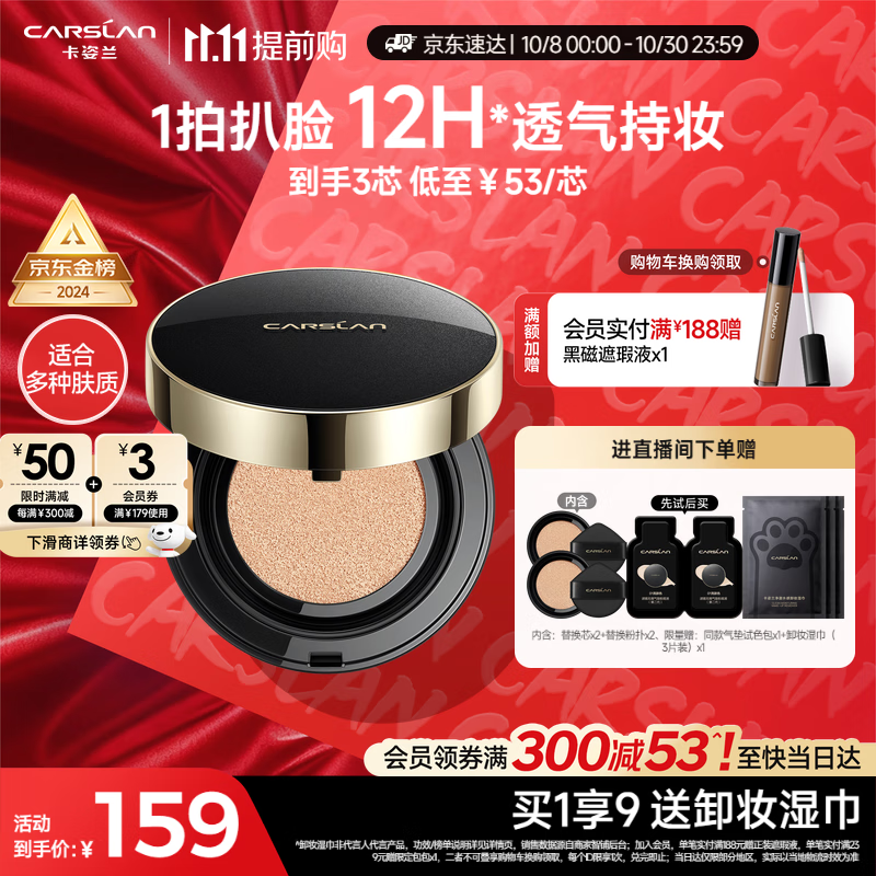 卡姿兰(Carslan)黑金气垫BB霜2.0遮瑕控油保湿不脱粉底液01亮肤色14.5g*3生日礼物