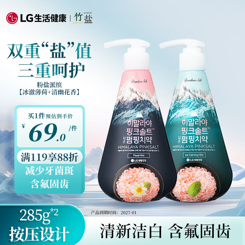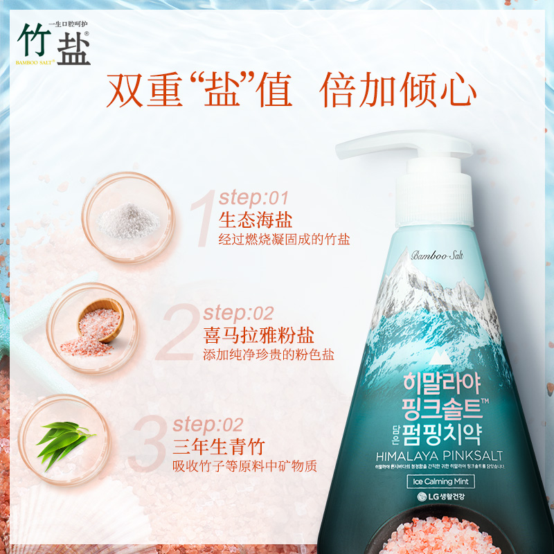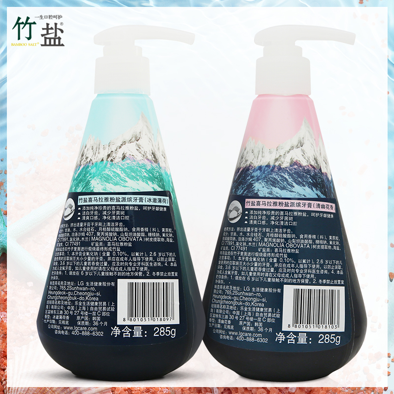 竹盐LG派缤按压式牙膏粉盐285g*2瓶(冰澈薄荷+清幽花香)效期2027年1月