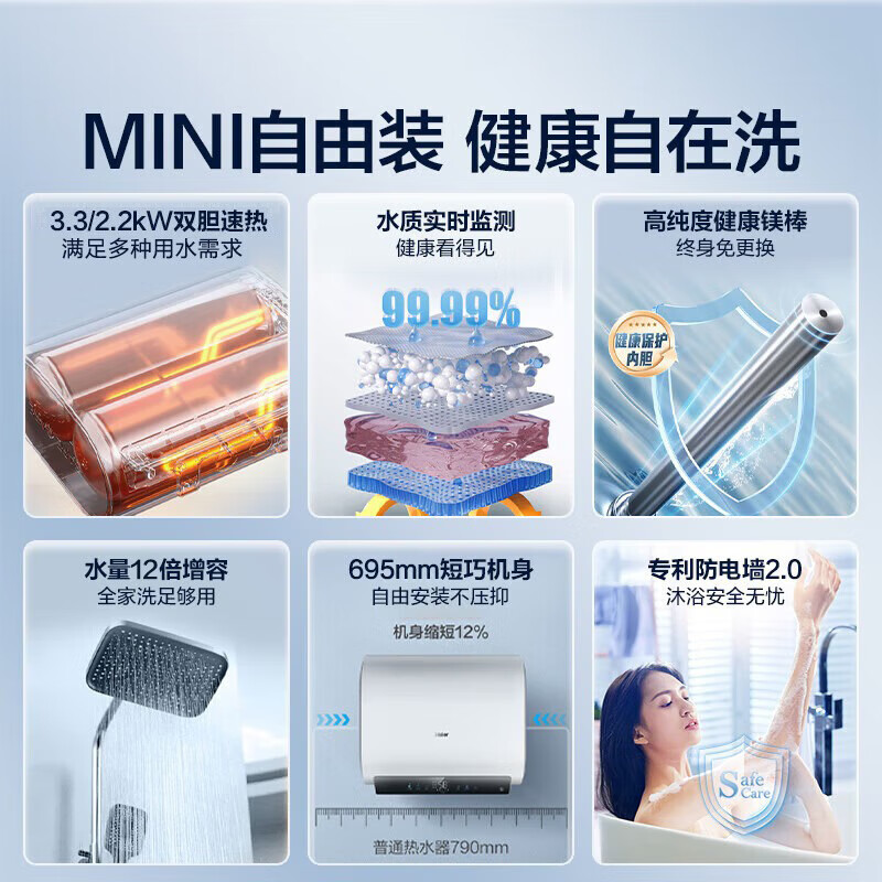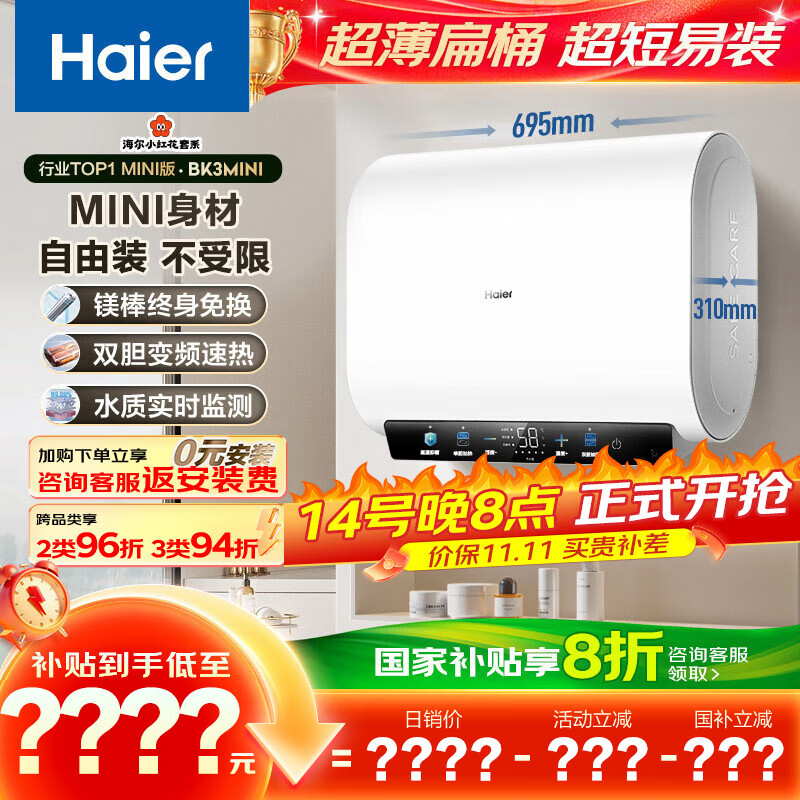 海尔(Haier)国家补贴20%双胆扁桶电热水器60升 小红花BK3MINI 鲜活水 3300W变频速热一级能效节能家用镁棒免换
