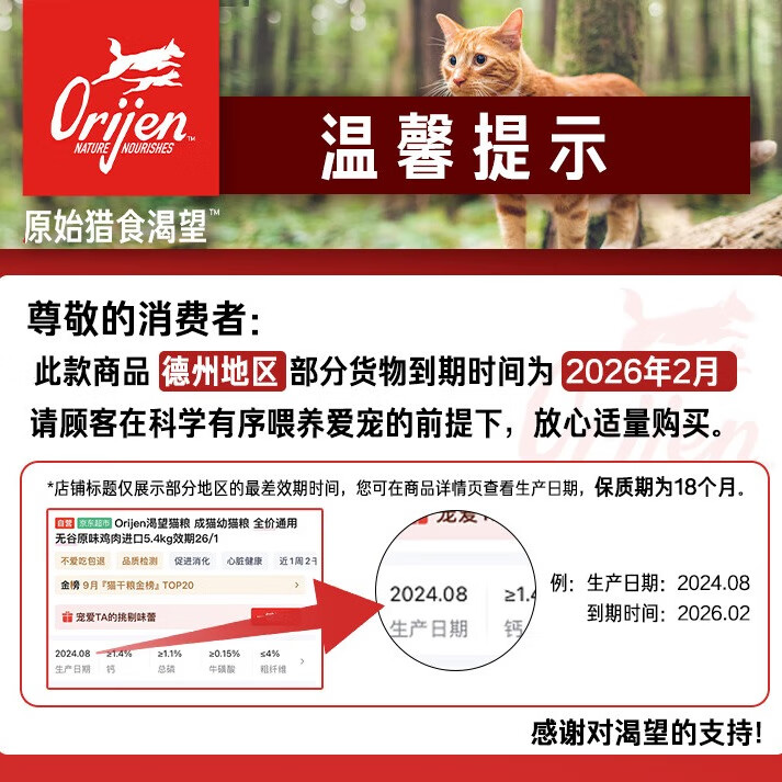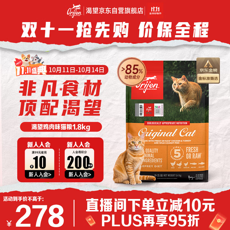 Orijen渴望猫粮 成猫幼猫粮 全价通用无谷原味鸡肉进口1.8kg效期26/4