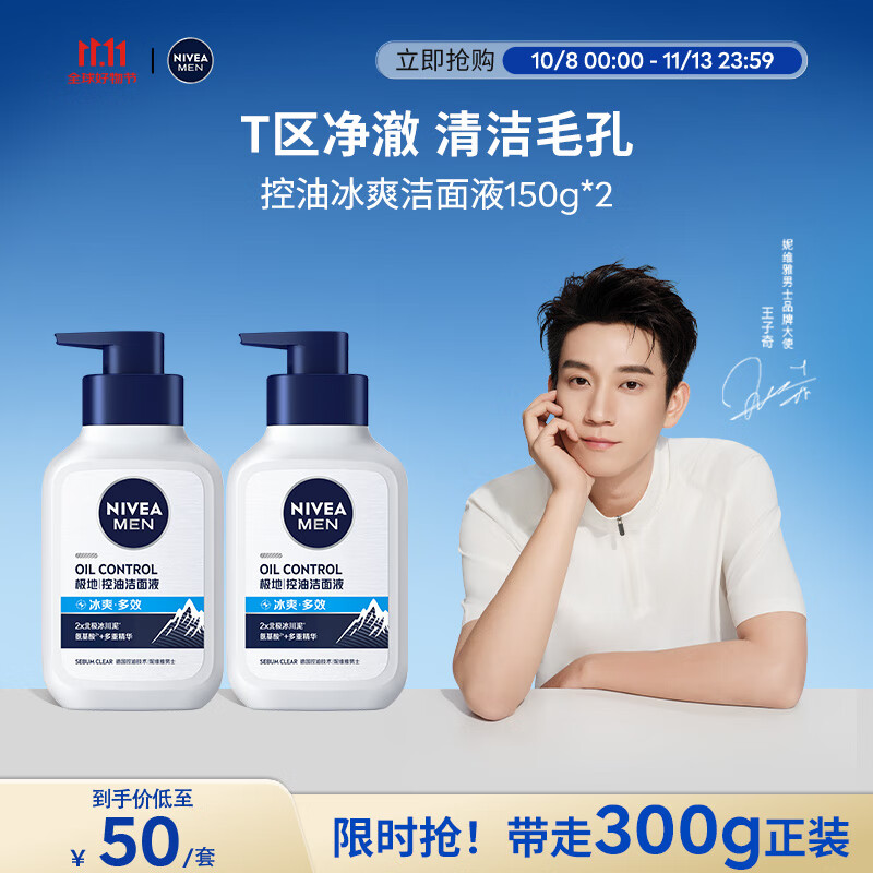 妮维雅(NIVEA)男士【王子奇推荐】控油冰爽洁面液150g双支洗面奶氨基酸青少年