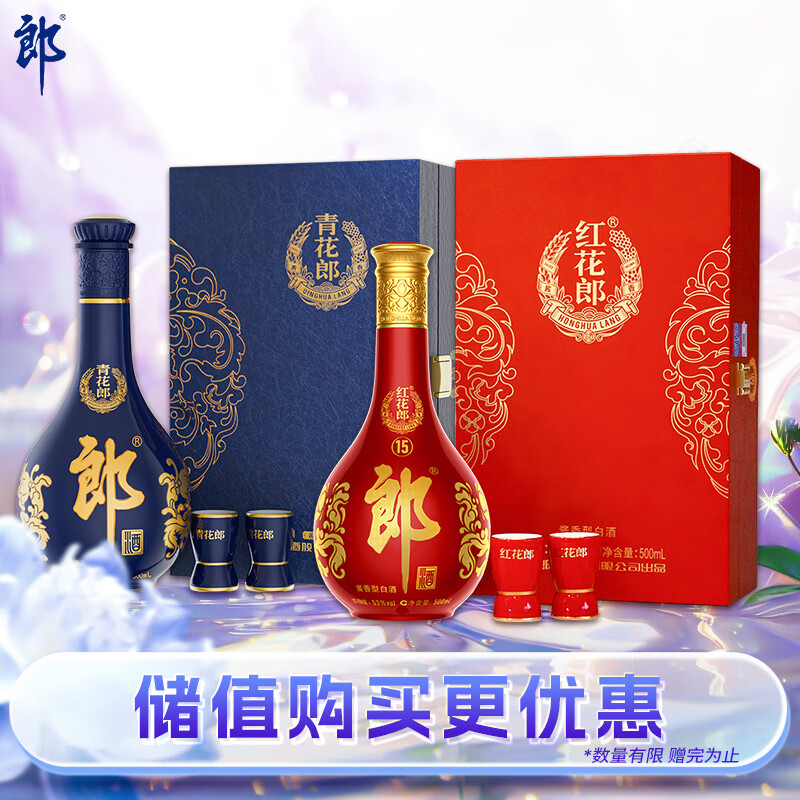 郎酒红花郎15酱酒 500ml*1+青花郎500ml*1 礼盒装 (新老包装随机发货)