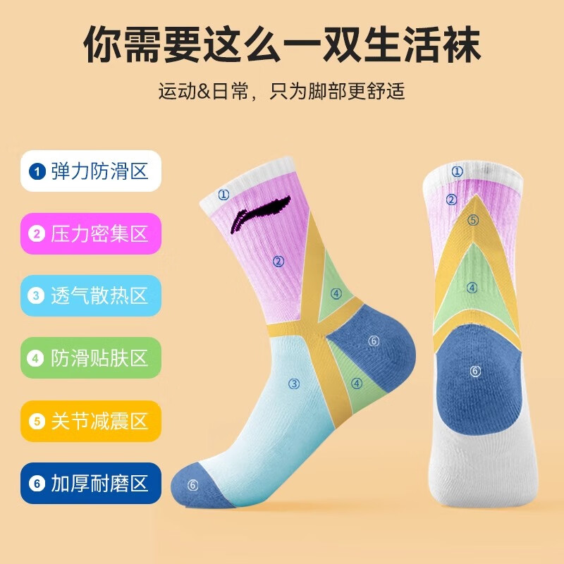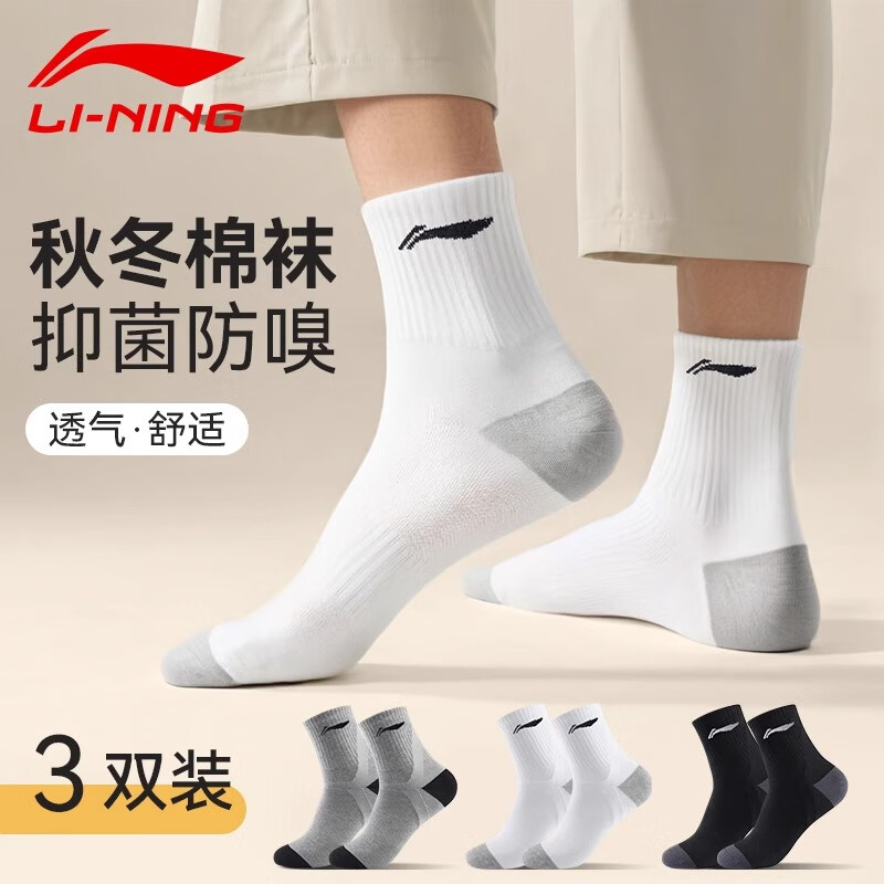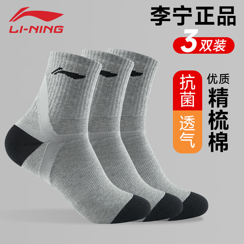 李宁袜子运动袜篮球袜羽毛球袜男女跑步训练吸汗透气棉袜子抗菌生活袜 灰色3双装【抗菌舒适吸汗透气】 XL码【42-46码】
