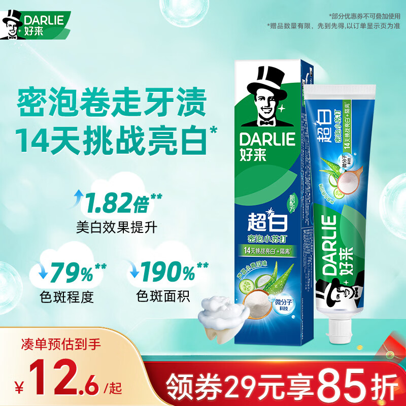 好来(DARLIE)【白鹿推荐】超白密泡小苏打牙膏亮白去黄芦荟小青瓜190g新旧包装