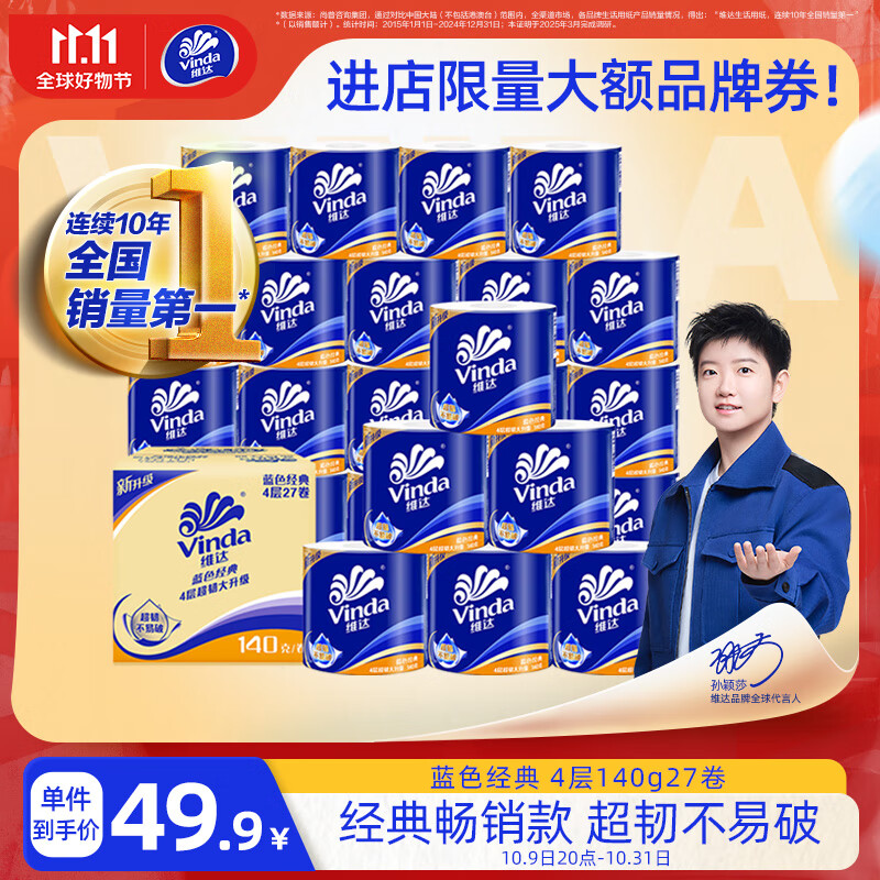 维达(Vinda)有芯卷纸【孙颖莎推荐】蓝色经典4层140克*27卷 卫生纸纸巾 整箱