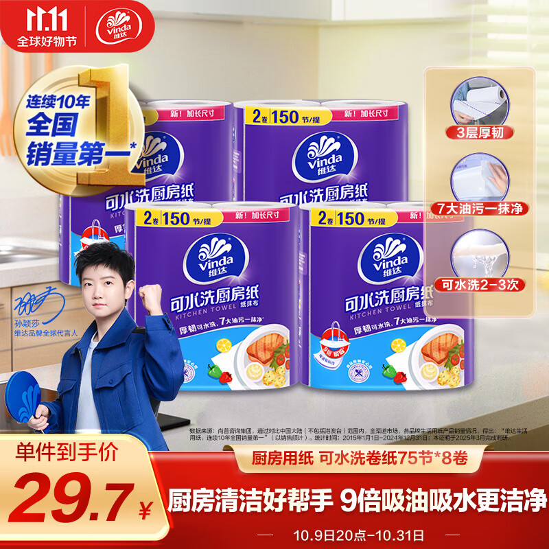 维达(Vinda)厨房卷纸【孙颖莎推荐】可水洗75节*8卷 懒人抹布 厨房用纸 整箱
