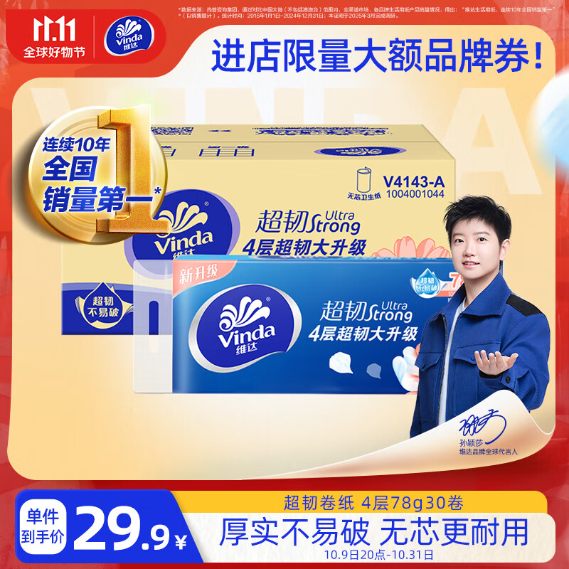 维达(Vinda)无芯卷纸 超韧4层78克*30卷 加厚升级 卫生纸厕纸卷筒纸纸巾整箱