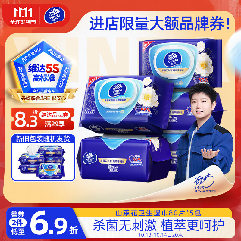 维达(Vinda)杀菌湿巾【孙颖莎推荐】80片*5包 山茶花精华大包 新旧随机发货