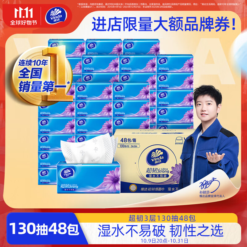 维达(Vinda)抽纸 超韧3层130抽*48包S码 湿水不易破 餐巾纸 纸巾卫生纸 整箱