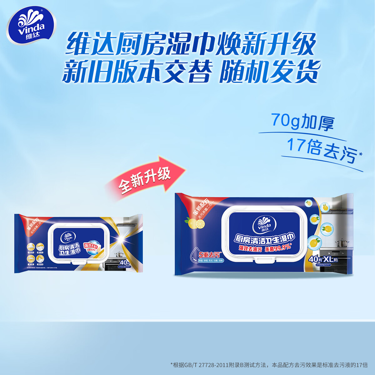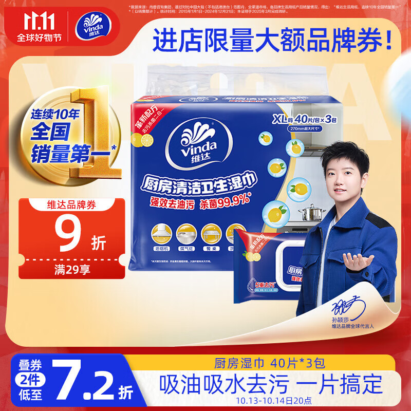 维达(Vinda)厨房湿巾 40片*3包 超大加厚尺寸 厨房湿巾去油污 厨房用纸