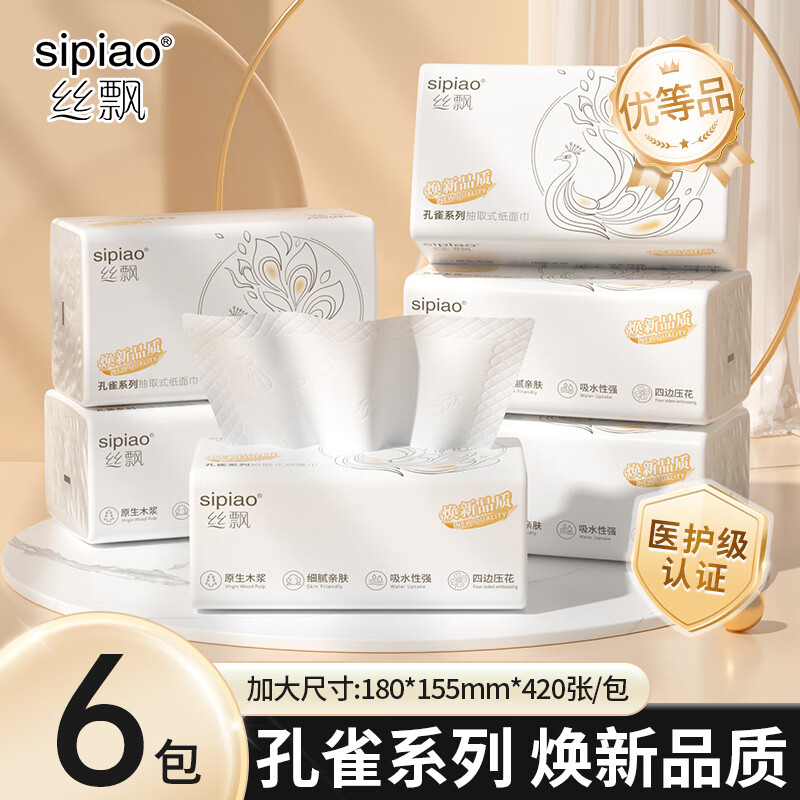 丝飘大尺寸抽纸420张五层加厚餐巾纸家用大号面巾纸母婴用纸 5层 420张*6包