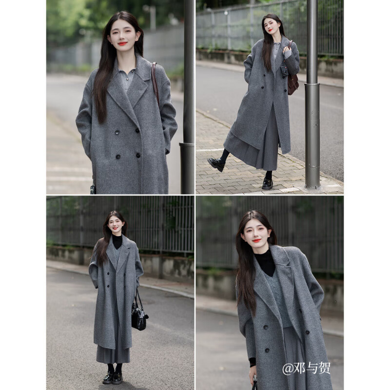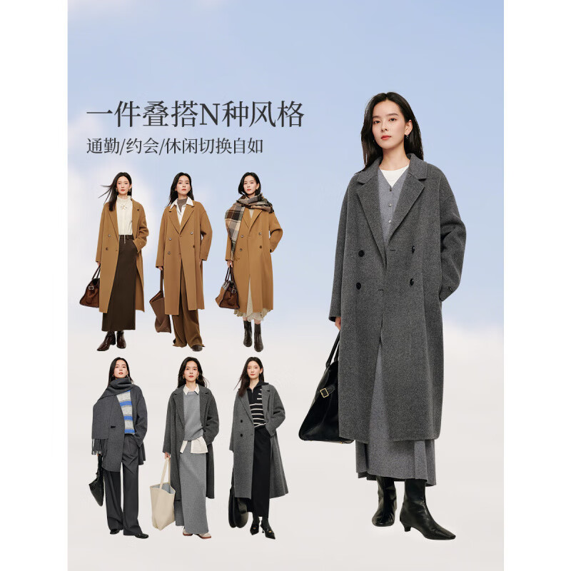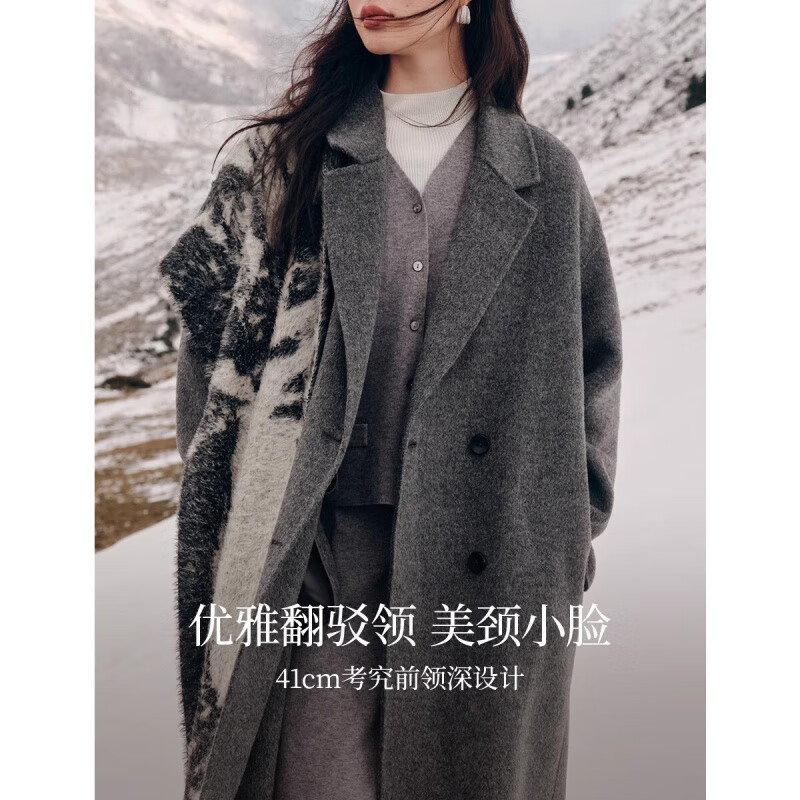 茵曼(INMAN)2025秋冬女新款绵羊毛双面呢外套女美拉德翻驳洋气长款大衣上衣 深花灰 S