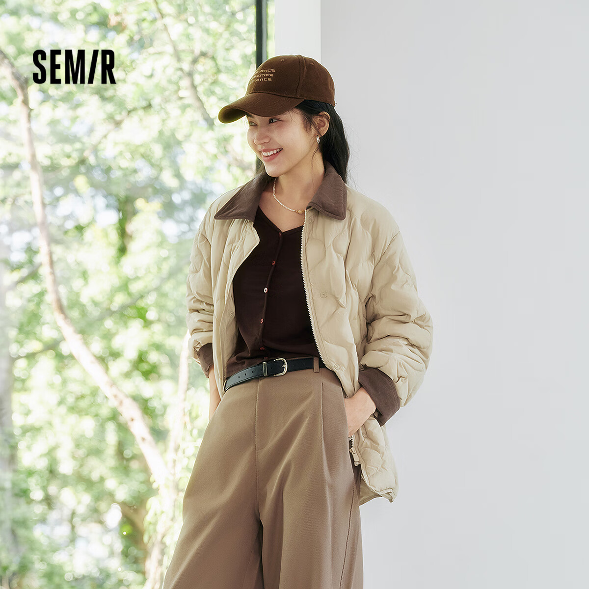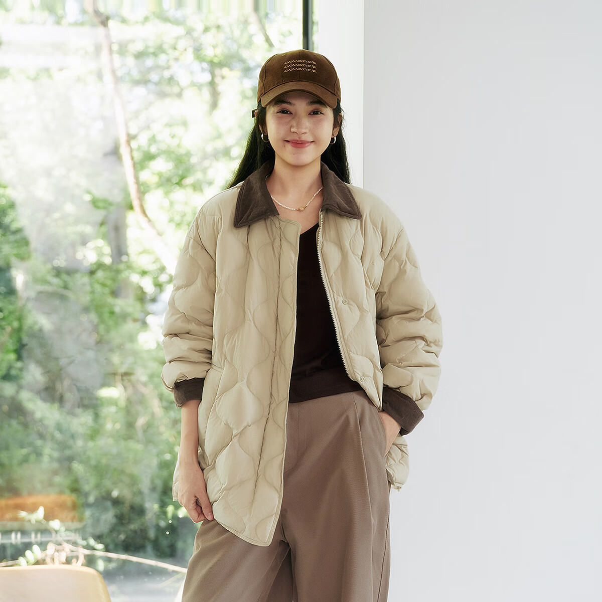 森马(Semir)羽绒服女中长款轻薄肌理宽松2025撞色灯芯绒翻领冬装109725113027