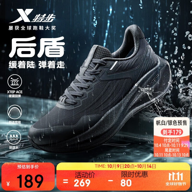 特步后盾跑步鞋运动鞋秋季新款轻便减震回弹防滑防泼水男子跑鞋黑色