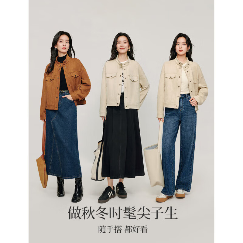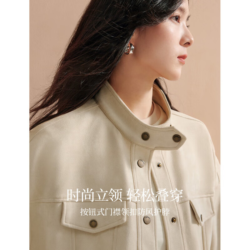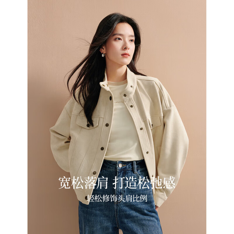茵曼(INMAN) 外套女复古麂皮绒休闲宽松长袖小个子夹克上衣 浅杏色 M
