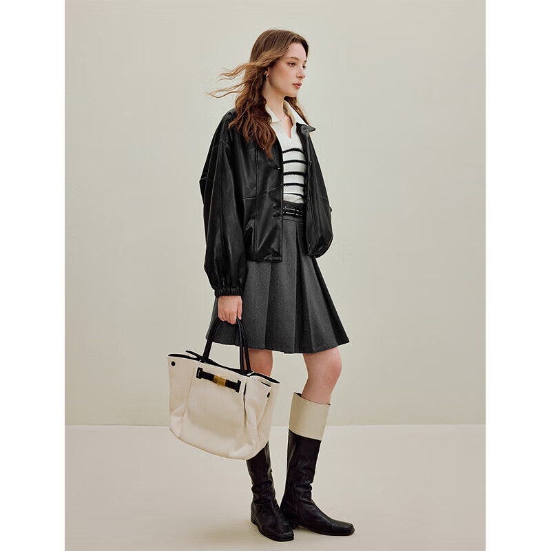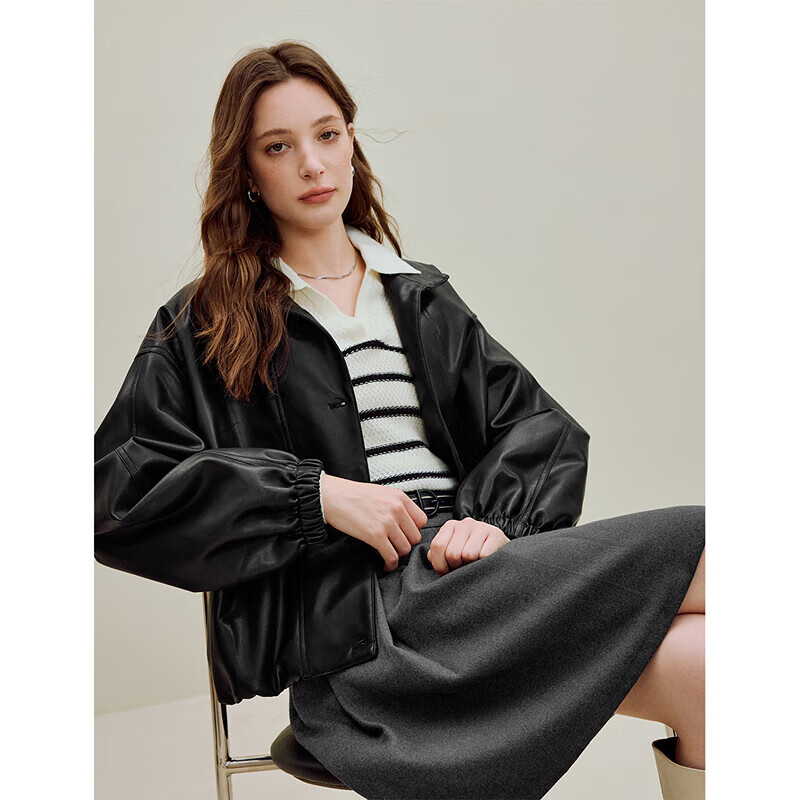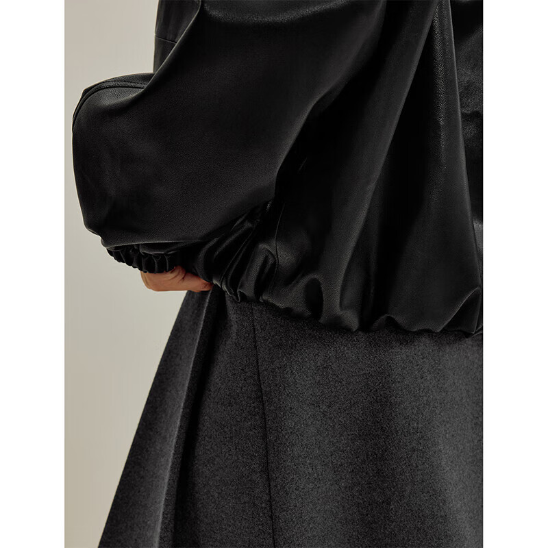 茵曼(INMAN)2025秋冬女装新款简约立领皮衣黑色外套短款夹克上衣 午夜黑 M