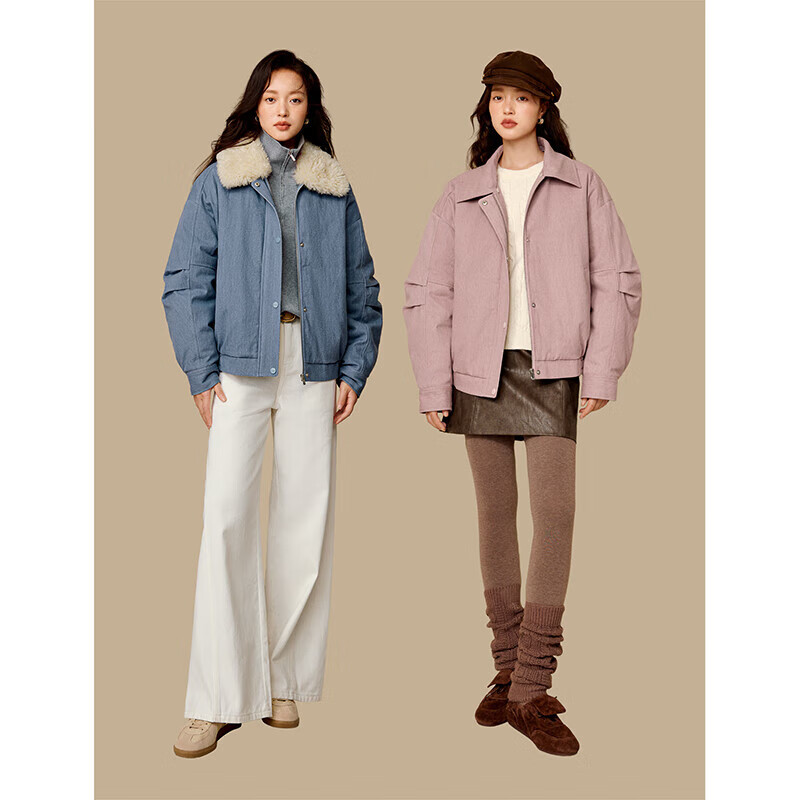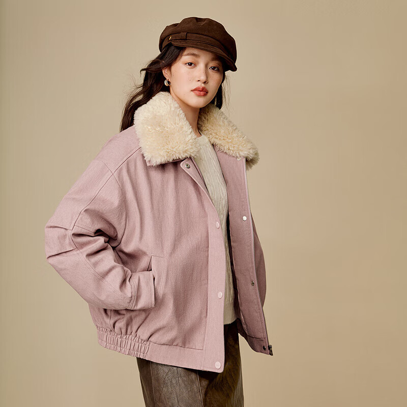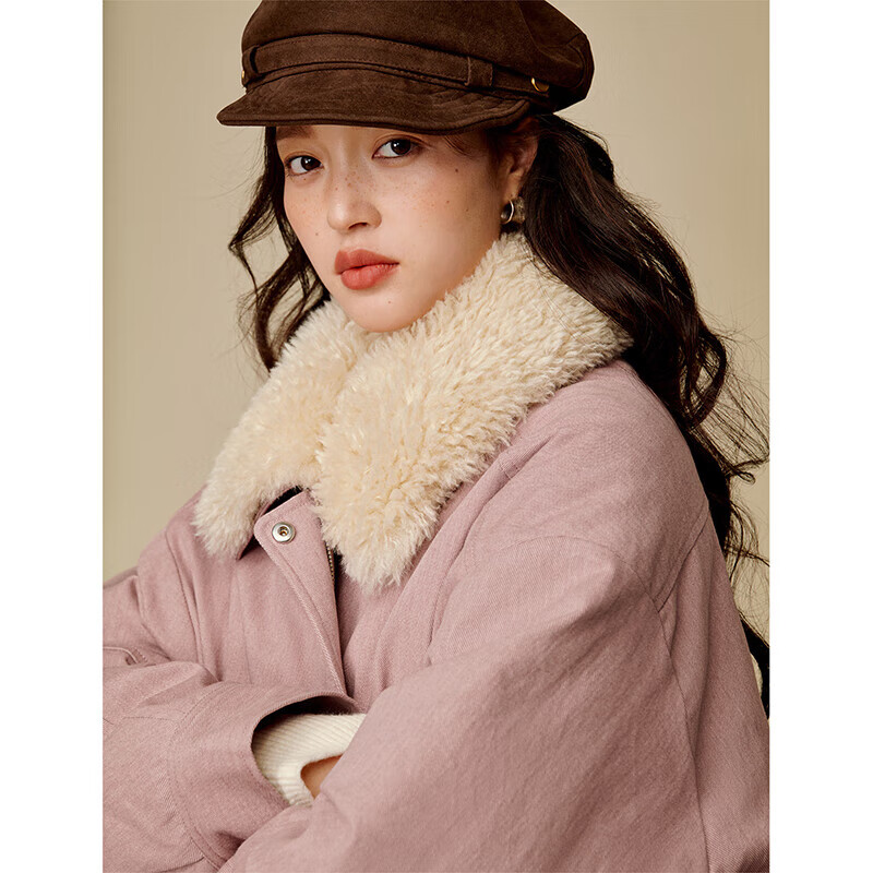 茵曼(INMAN)2025秋冬女装新款水洗仿牛仔夹克羽绒服短款羊羔毛翻领外套 皮粉色 S