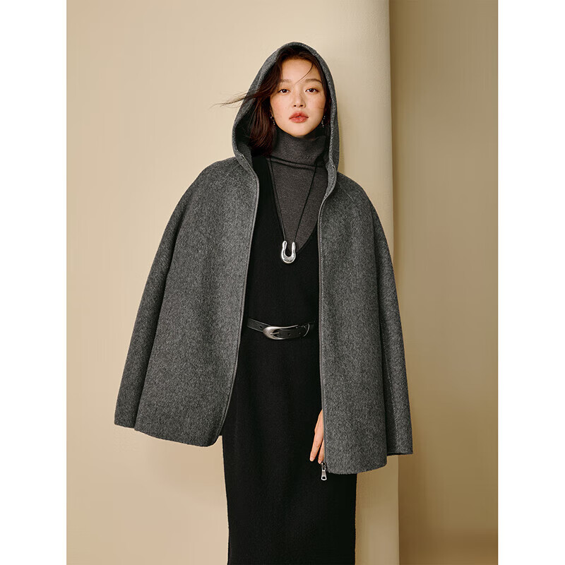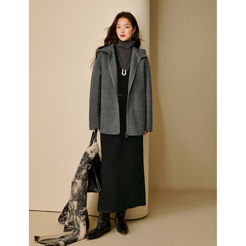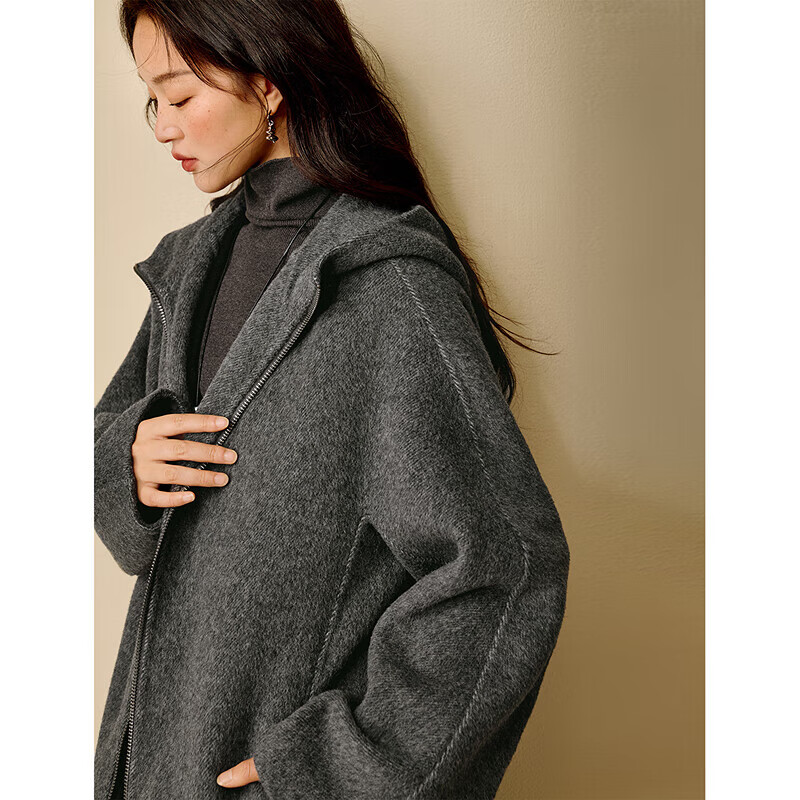 茵曼(INMAN)2025秋冬女装新款羊驼毛桑蚕丝连帽双面呢大衣格雷系毛呢外套 雅典灰 S
