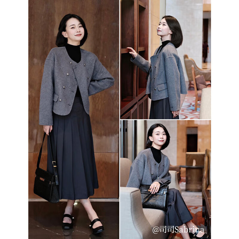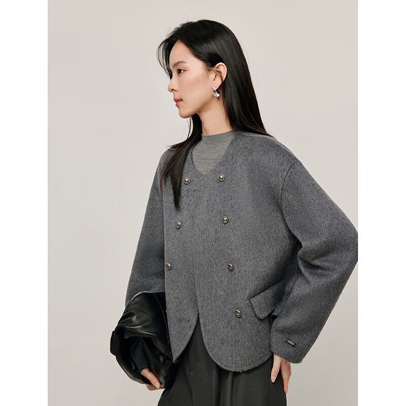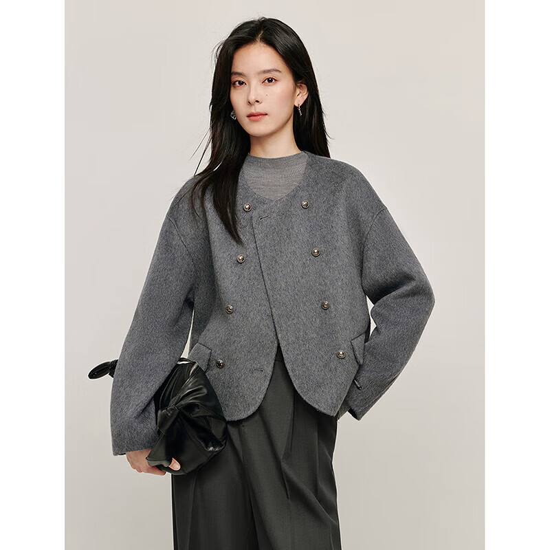 茵曼(INMAN)2025秋冬女新款羊驼桑蚕丝双面呢外套感双排扣圆领短款大衣上衣 雅典灰 M