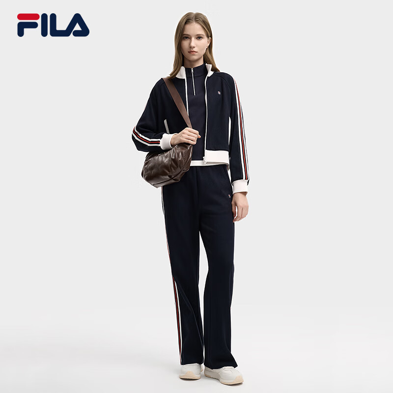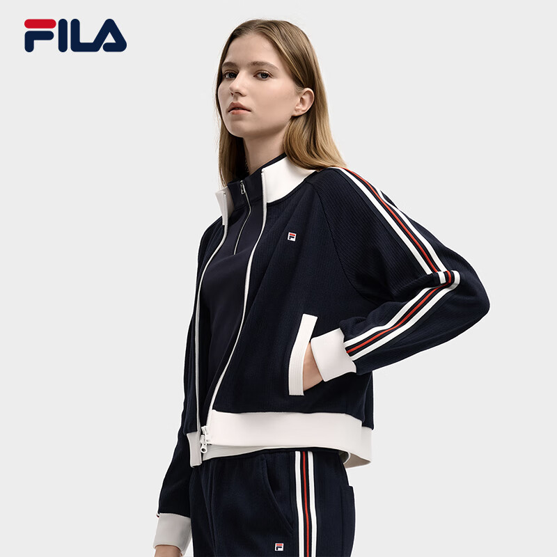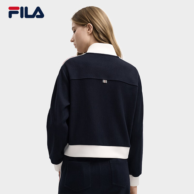 FILA 斐乐官方女装针织长袖外套2025冬新款休闲宽松拼色立领上衣 传奇蓝-NV S 160/80A/S