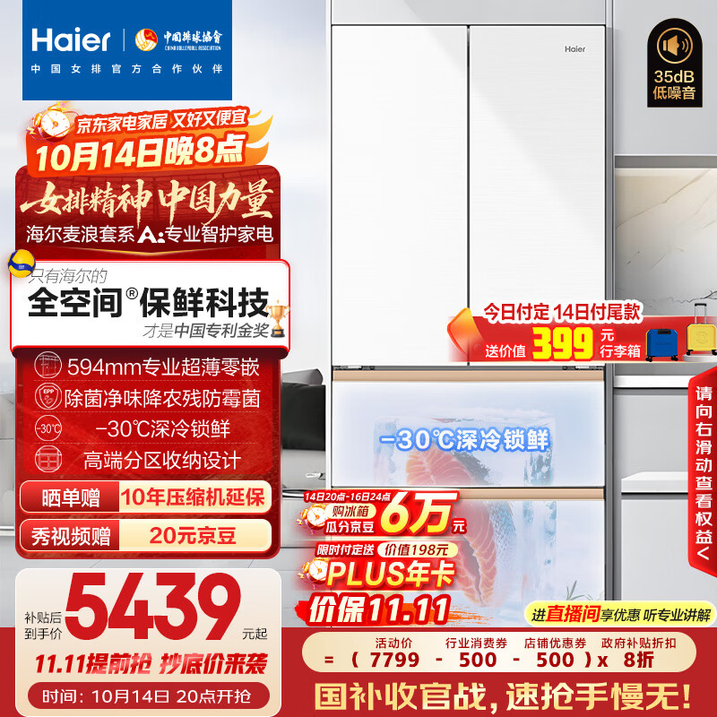海尔(Haier)「麦浪套系」511升全空间保鲜超薄零嵌法式多门家用电冰箱BCD-511WGHFD1BWLU1国家补贴20%