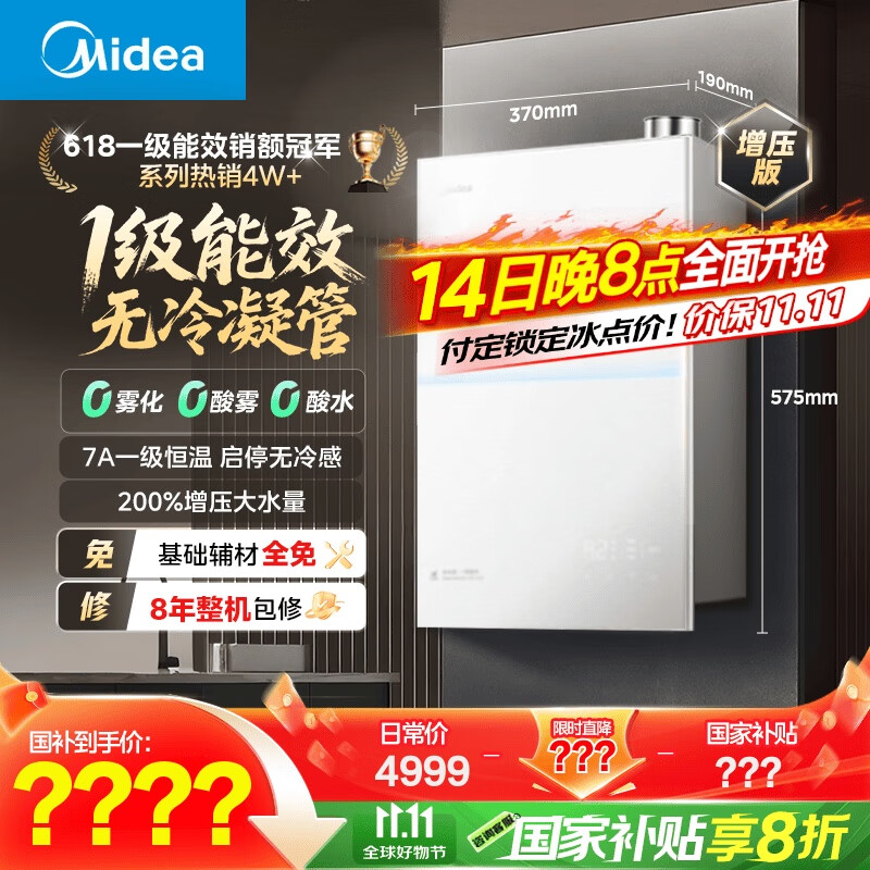 美的(Midea)【一级能效无冷凝M10S Max】16升燃气热水器天然气【增压无冷感7A恒温静音下置风机】白色 国补8折