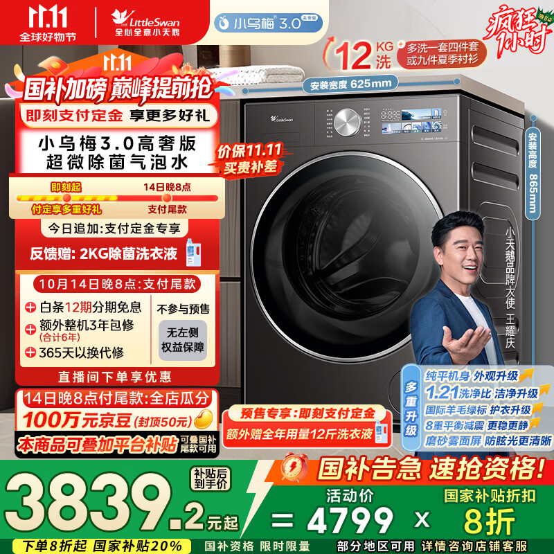 小天鹅(LittleSwan)滚筒洗衣机全自动家用 纯平全嵌【小乌梅3.0高奢版 TG12VE40PRO】家电国家补贴20% 以旧换新 超薄