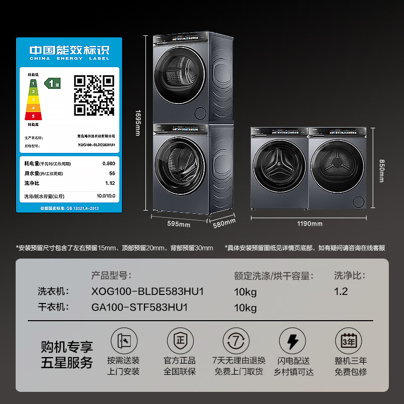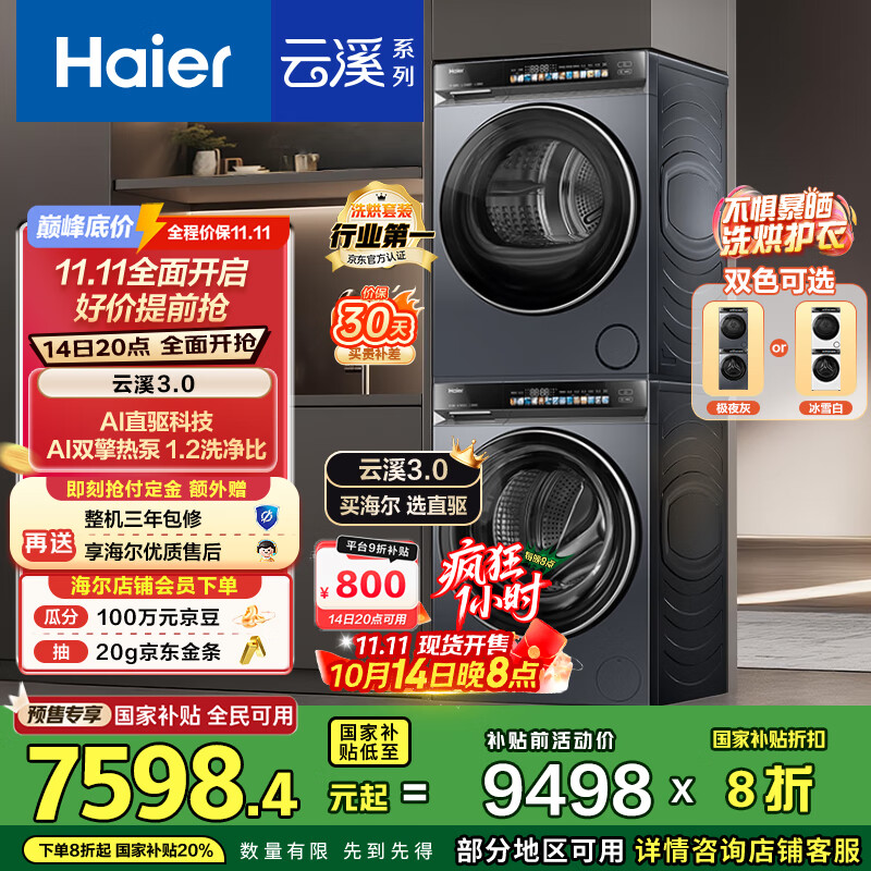 海尔(Haier)云溪3.0 洗烘套装 10KG直驱滚筒懒人全自动洗衣机+热泵烘干机 京东自营 583+583 家电国家补贴