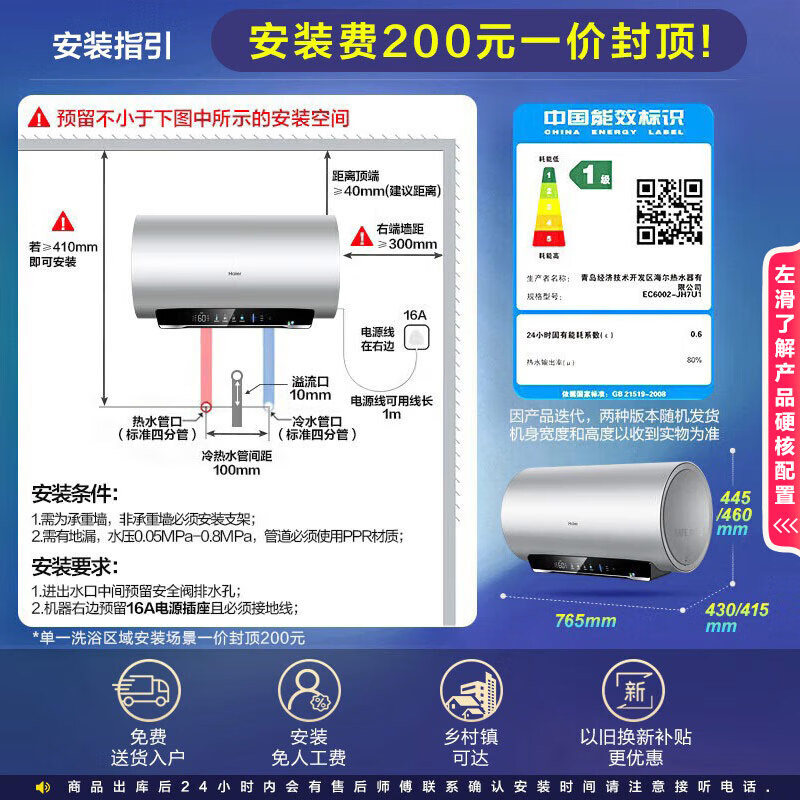 海尔(Haier)国家补贴20%电热水器60升 小红花JH7 无垢鲜活水净肤洗 免清洗 3300W变频速热一级能效 家用储水式
