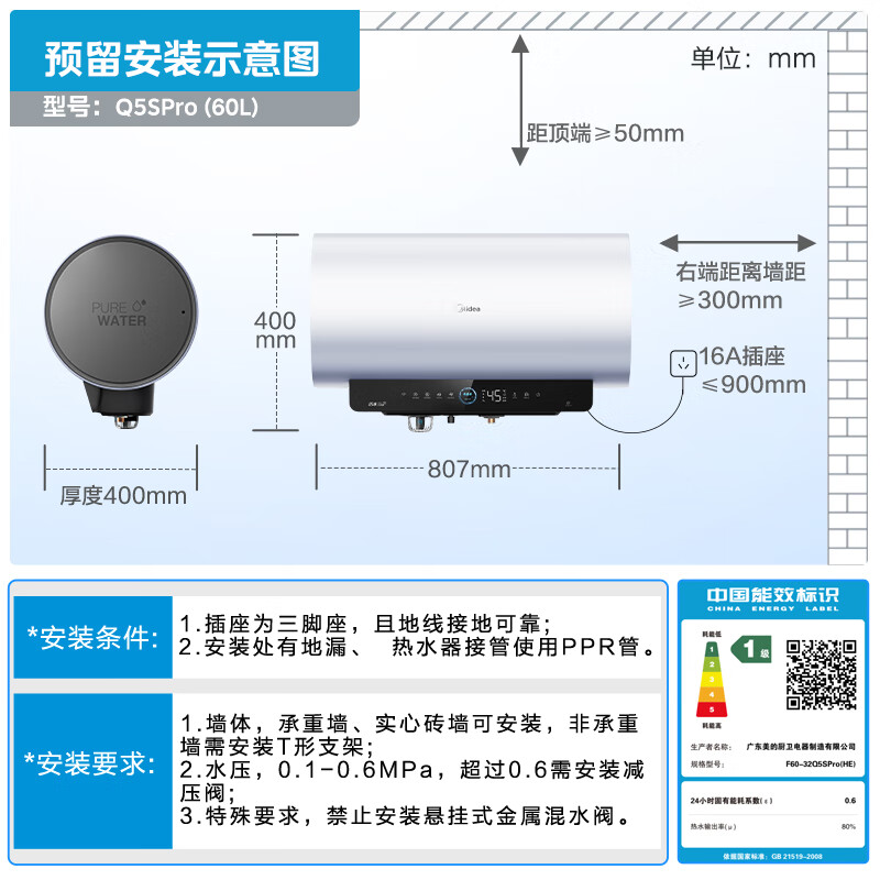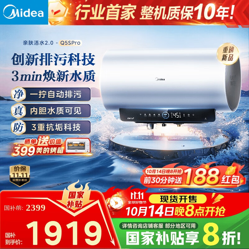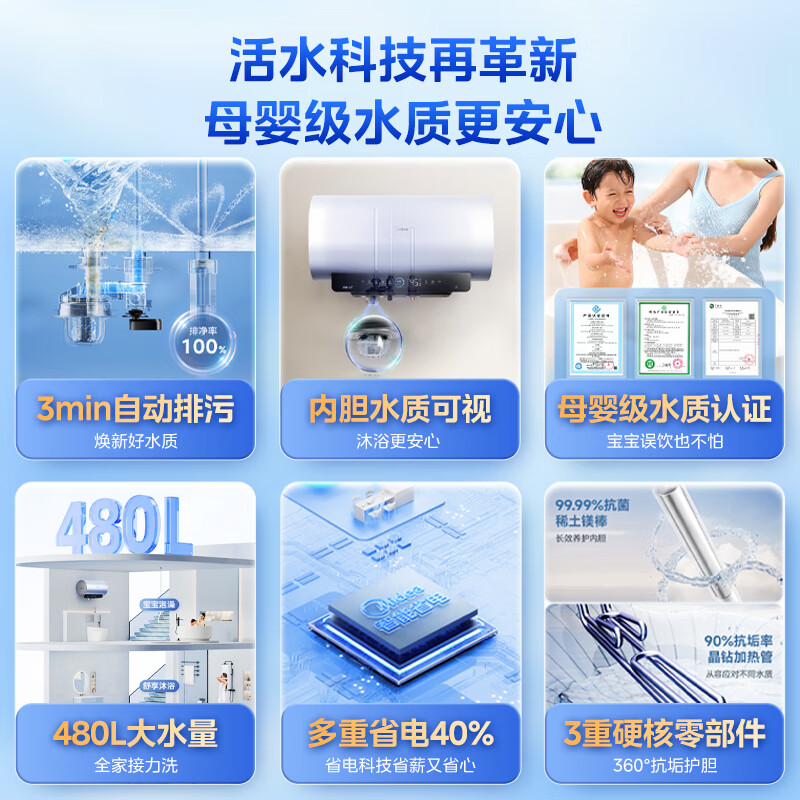 美的(Midea)国家补贴20%【活水2.0】自动排污免换镁棒3200W节能速热储水式60L家用电热水器F60-32Q5SPro(HE)