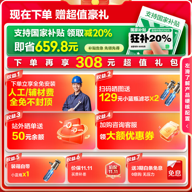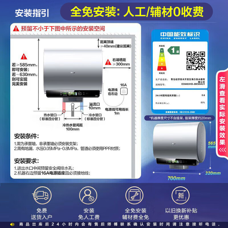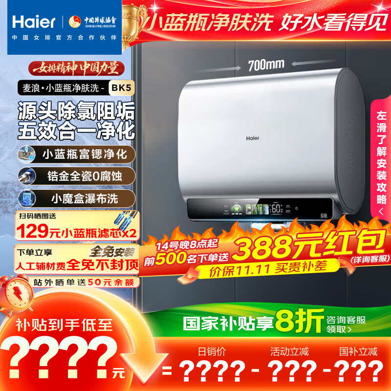 海尔(Haier)麦浪套系电热水器 国家补贴20%双胆扁桶60升BK5 富锶小蓝瓶净肤洗 锆金全瓷3300W速热家用一级能效