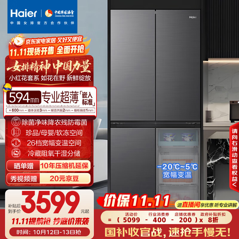 海尔(Haier)【小红花套系】472升594mm专业超薄零嵌十字T型电冰箱家用一级能效BCD-472WGHTDB9SYU1国家补贴20%