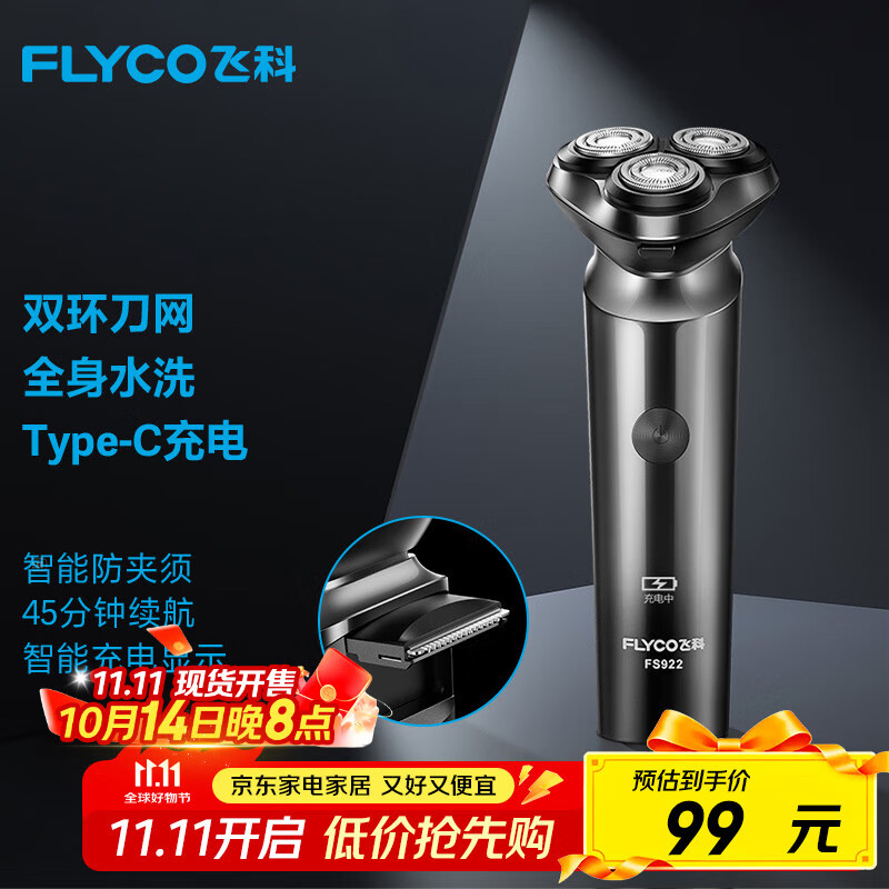 飞科(FLYCO)男士电动剃须刀旋转式全身水洗干湿双剃便携款刮胡刀生日礼物送男友送父亲FS922