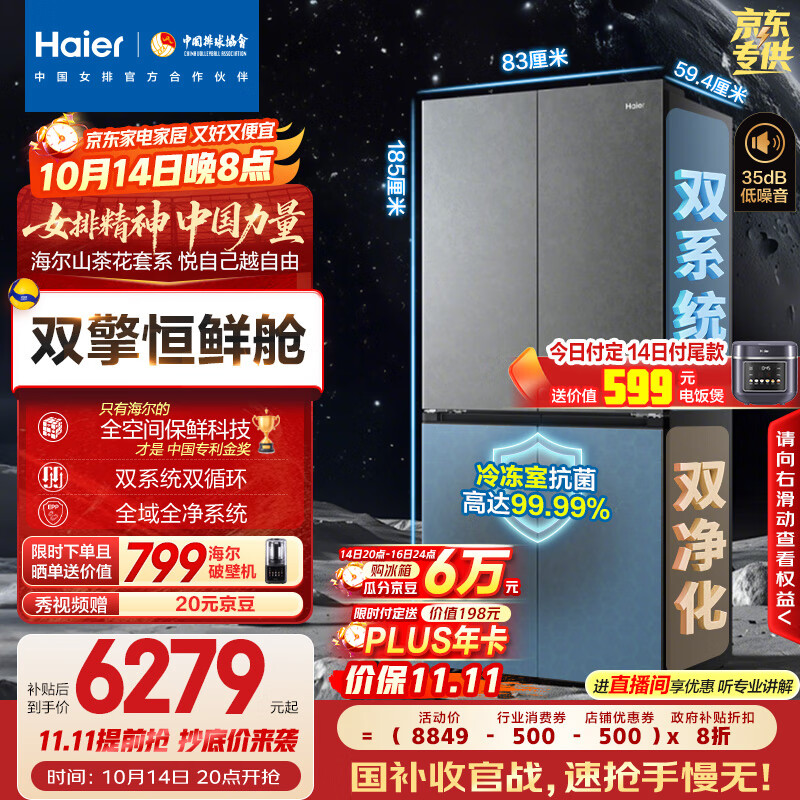 海尔(Haier)「山茶花-曜夜」502升双擎恒鲜舱双系统全空间保鲜594mm超薄零嵌十字冰箱BCD-502WGHTD1CYXU1